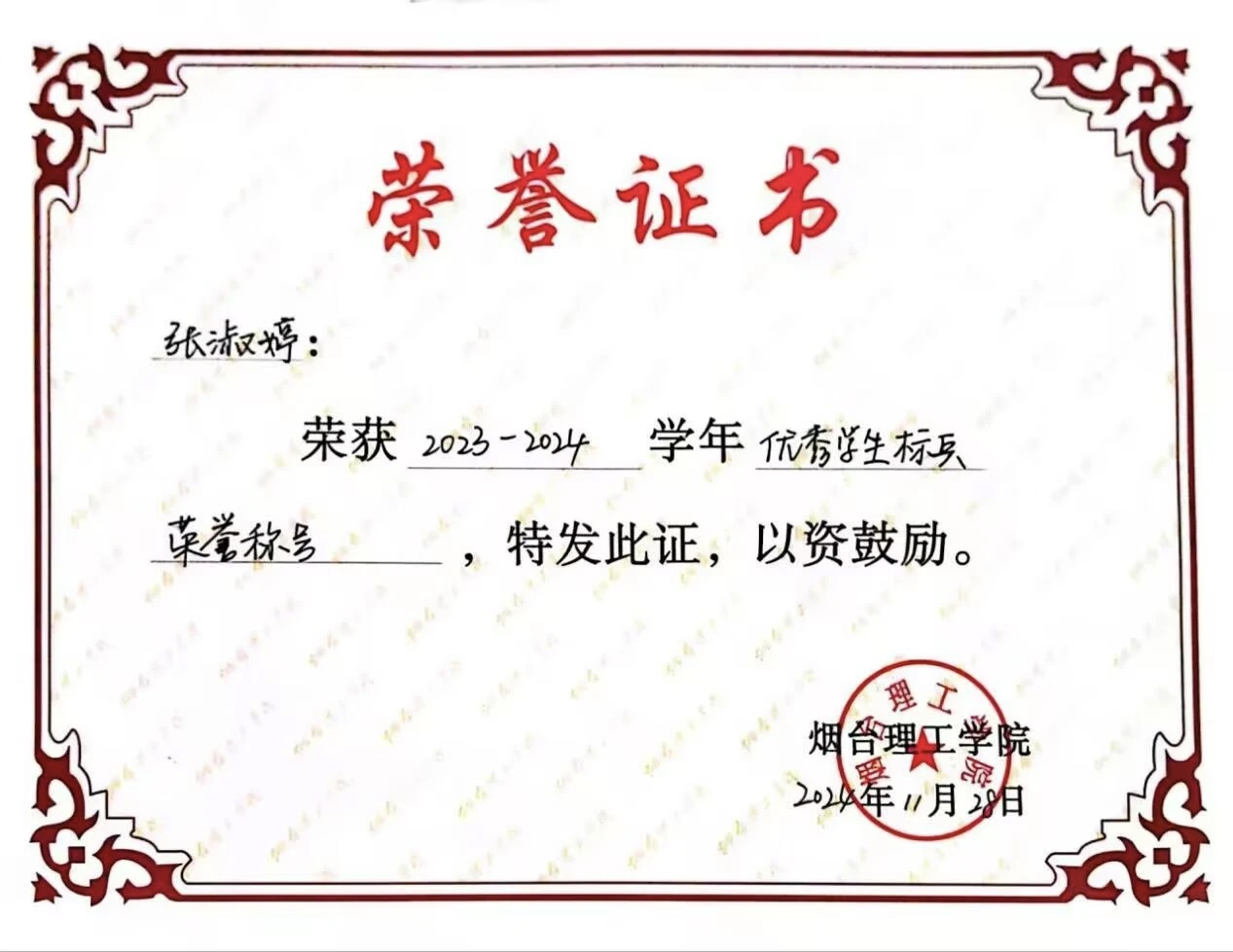 与此同时,在创新创业和集体建设的道路上,张淑婷同样表现亮眼,创新创业方面,她参与的项目获得2023年老员工创新创业训练校级立项,在创新的道路上迈出了坚实的一步;集体建设中,她所在的团支部先后被评为2023年度“红旗团支部”和2023-2024学年“优秀主题团日”,她在其中发挥了积极的作用,为集体荣誉贡献了自己的力量。