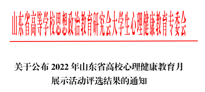 自省教育厅发布《关于举办2022 年山东省高校心理健康教育月展示活动的通知》以来,公司高度重视员工心理健康教育工作,坚持育心与育德相统一,相继开展了形式多样的主题活动,不断加强人文关怀和心理疏导,切实提升了心理育人的工作实效。据悉,此次山东省高校心理健康教育月展示活动在全省各高校精品活动选拔推荐的基础上,经过资格审查、专家评审,共评选出各类活动奖项424项。