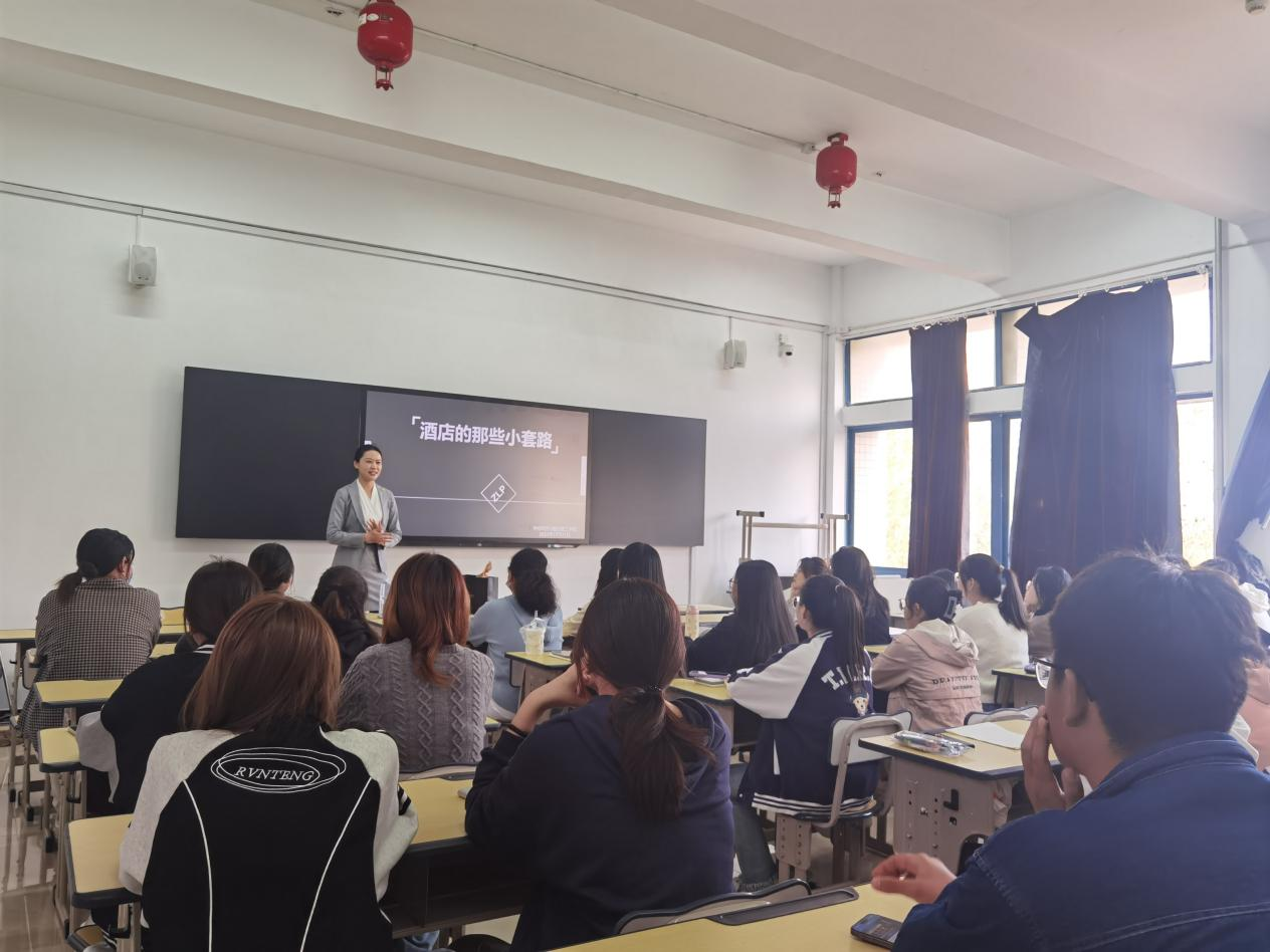 10月31日,烟台地区中泽华羿铂尔曼酒店人力资源总监王青女士应邀来到太阳成集团tyc9728,以“酒店的那些小套路”为主题于一教513-2教室向2022级、2023级酒店管理专业员工进行精彩讲解,酒店管理系主任胡翠霞及全体员工参加。