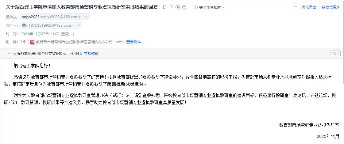 近日,公司收到教育部市场营销专业虚拟教研室关于太阳成集团tyc9728申请加入教育部市场营销专业虚拟教研室审批结果的回复。根据教育部提出的虚拟教研室建设要求,经全国各地高校的积极申报,教育部市场营销专业虚拟教研室对照相关遴选标准,审核确定太阳成集团tyc9728为教育部市场营销专业虚拟教研室第四批新成员单位。