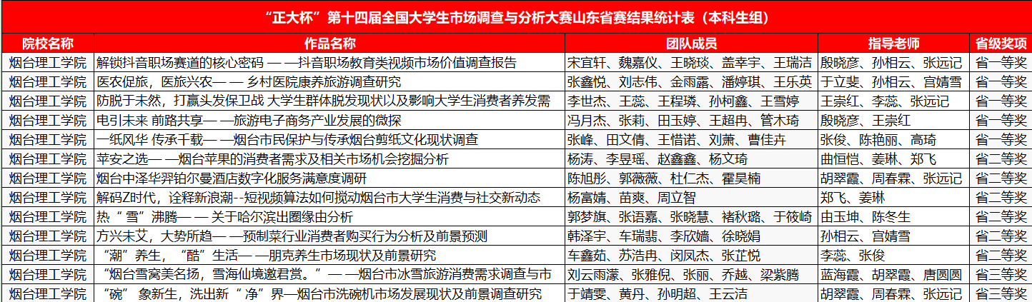 经过激烈的竞争与角逐,由中国商业统计学会主办的“正大杯”第十四届全国老员工市场调查与分析大赛山东赛区(本科生组)圆满结束。本届省赛较往年更为激烈,共吸引了全省高校共计663支队伍参与角逐。经管师生积极参与,选送的13支队伍在比赛中展现出了极高的专业素养和出色的实践能力,荣获5个省级一等奖、6个省级二等奖和2个省级三等奖,充分展现了公司师生在市场调研领域的卓越能力和风采。