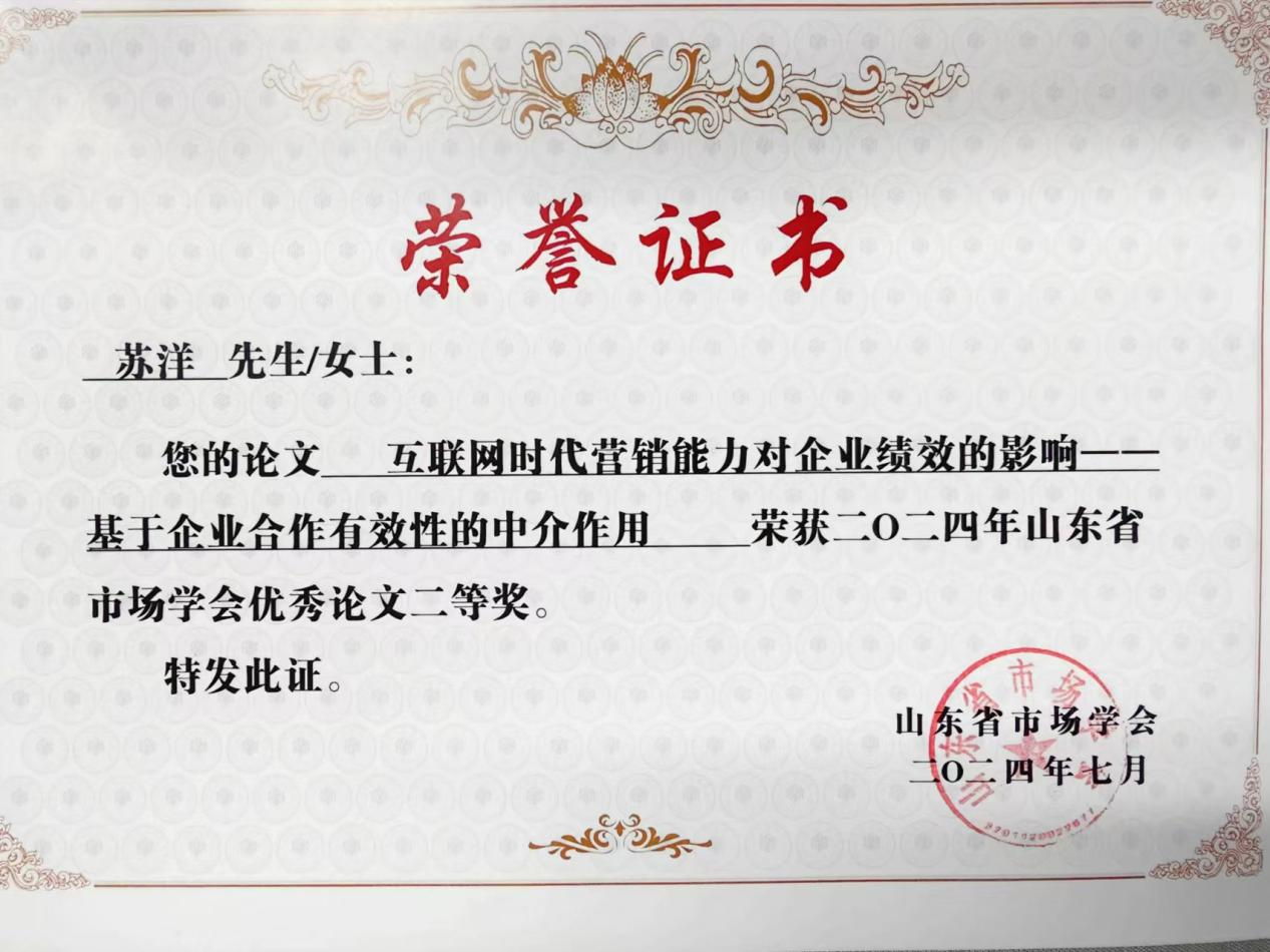 会议按计划圆满完成了各项议程。公司苏洋老师当选山东省市场学会副会长。同时荣获2024山东省市场学会优秀论文二等奖。