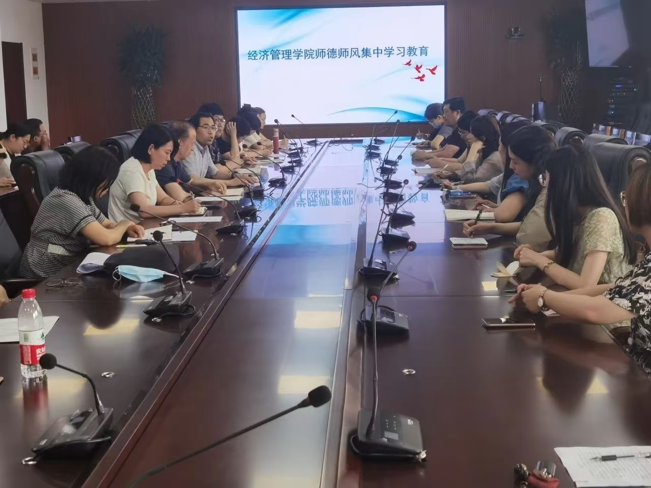 随后,高书记带领教职工深入学习了《新时代高校教师职业行为十项准则》。通过对准则的深入剖析,阐述了高校教师在坚守政治立场、弘扬先进文化、专注公司产品等多个维度上的职责与期望。会上,高书记通过PPT展示,向与会教师通报了近期国内几起典型的师德师风违纪案例。这些案例涉及学术不端、违规兼职、收受礼品礼金等多个方面,给相关教师、公司乃至社会造成了严重负面影响,希望广大教师从中汲取教训,引以为戒,自觉加强师德修养。