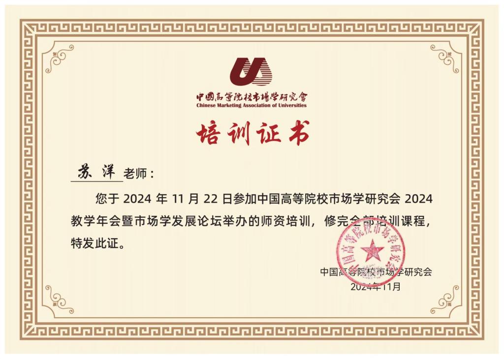 苏洋教授围绕数智时代市场营销学的新质人才议题,同与会嘉宾深入探讨数字化转型下的市场营销学团队培养、教学设计、教材和案例开发以及产学研融合等主题,对于推动公司省级一流本科重点建设专业—市场营销专业建设与人才培养具有重要意义。同时公司市场营销专业还以本次大会为契机,顺利申请成为教育部市场营销学课程虚拟教研室理事单位。