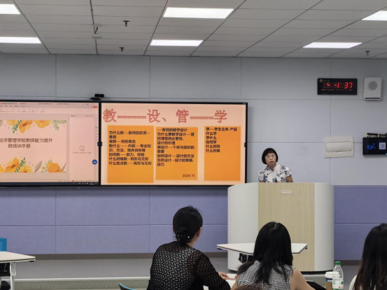 人力资源系主任张俊则围绕日常教学设计分享,系统讲解了如何从教学目标出发,科学设计教学环节、分配课堂时间、融入课程思政元素,使课堂教学既有条理又生动有效。市场营销系主任解萍则聚焦教学评价环节,分享教学与平时成绩整合方法,讲解如何通过学习通设计平时成绩评定体系,使其真实反映员工学习过程,激发员工持续努力的动力。孙经纬教授结合实践类课程的教学需求,以诙谐幽默的亲身案例为新教师介绍了实践课教学经验与方法分享。