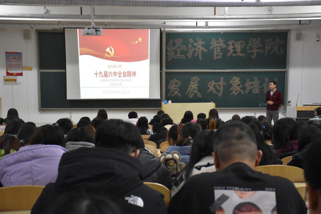 会议伊始,高书记介绍本次发展对象培训的具体安排和要求,希望各位学员严格要求自己,遵守学习纪律,理论与实际相结合,做到学以致用。随后,高书记围绕“十九届六中全会精神”展开解读,分别解释了“十九届”、“六”、“中”、“全会”名词的含义。随后通过PPT带领大家共同学习习总书记讲话,从审议通过两个文件、总结重大成就和历史经验的三个“需要”、马克思主义中国化的三次飞跃等九个方面的内容进行讲解,使各位发展对象对全会精神有了进一步认识。紧接着,高书记通过央视党章公开课进行党章解读,要求大家能自觉结合相关资料进一步学习和梳理。最后,高书记强调作为一名发展对象,要以优秀党员为榜样,汲取大无畏精神,始终坚定理想信念,以党员的标准严格要求自己,为社会贡献一份青春力量。