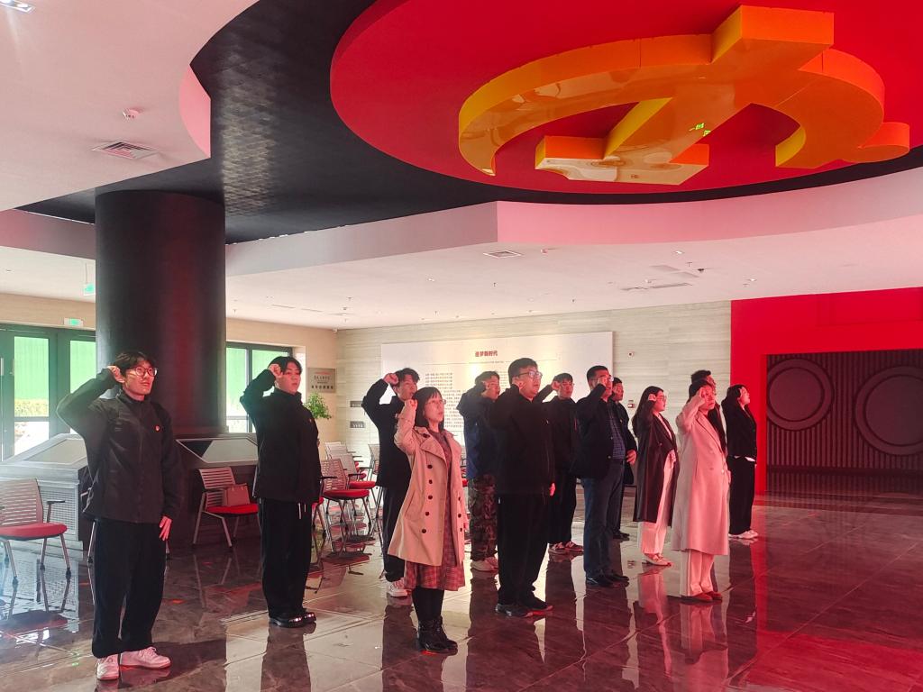 活动伊始,在“初心”展厅通过观看胶东革命纪录片,共同回顾中国共产党波澜壮阔的百年历程。通过讲解员的沉浸式宣讲,大家深入了解“胶东近代屈辱与抗争史”、“胶东革命斗争史”、“烟台社会主义革命和建设史”、“烟台改革开放发展历程”、“建设中国特色社会主义新政策”5个阶段的历史,通过现场观摩珍贵历史照片、动人英雄事迹、珍藏历史文物和各式精彩的高科技幻影成像,深刻感悟胶东“敢为天下先,奋勇走在前”的精神特质和革命发展艰辛历程与辉煌成就。最后,在展厅的庄严氛围下,教师党支部书记由玉坤担任领誓人带领大家进行宣誓,誓言回荡在展厅中仿佛穿透了岁月的尘埃,与革命先烈的英勇事迹融为一体,共同肩负着传承红色基因、续写辉煌篇章的重任。