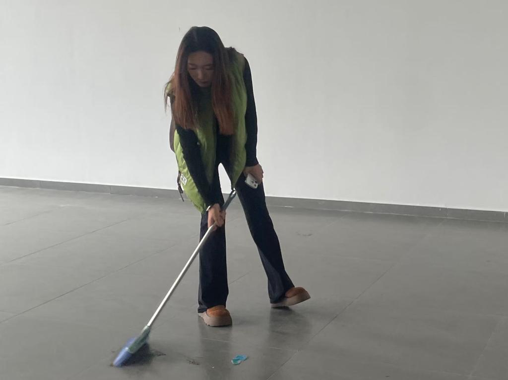 活动伊始,烟台市莱山区新华·翡翠观园社区主要负责人房女士面带笑容热情接待了各班团支书及团员代表,他结合社区民生需求,细致介绍了本次活动的核心阵地——社区服务站。据悉,该服务站未来将作为面向居民提供便民咨询、文化活动、民生帮扶的综合性平台,是打通基层服务“最后一公里”的关键节点。本次活动特别采用“一旧带一新”的传帮带模式,由老团员带领新团员熟悉志愿服务流程,让新团员融入角色,为活动高效推进筑牢基础。随后,在社区负责人与班级负责人的协同统筹下,志愿服务迅速进入“紧锣密鼓”的实操阶段。活动前期,负责人逐一细致核查扫帚、拖把、抹布等卫生工具的携带情况,男生团队主动扛起重活,负责三层区域五个房间及一个宽敞大厅的地面拖拭工作;女生团队则拿起抹布,擦拭窗户玻璃。帮助团员们在保证质量的前提下大幅提升效率。最后,全体参与人员与社区负责人并肩而立,在整洁明亮的社区服务站前共同合影留,为本次志愿服务画上圆满句号。
