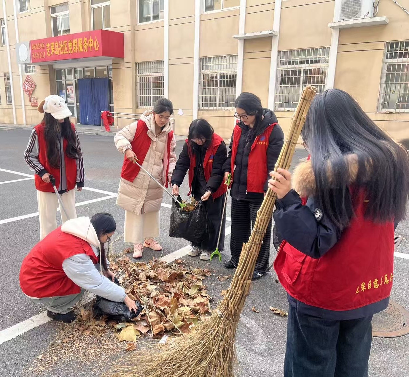 活动当天,团员们提前备好扫帚、簸箕、垃圾袋等工具,在社区工作人员的指引下迅速投入清扫工作。大家分工明确、配合默契:有的弯腰清扫人行道上堆积的落叶;有的用簸箕将落叶归集装袋;有的则主动将装满的垃圾袋搬运至指定回收点。遇到被风吹进草丛的碎叶,团员们便徒手捡拾,不放过任何卫生死角;看到行动不便的老人路过,还主动上前搀扶,提醒路面落叶易滑注意安全。
